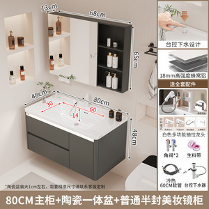 E4 グレー 80cm 普通ミラーキャビネット アークセラミック一体型洗面器 [台湾管理排水]