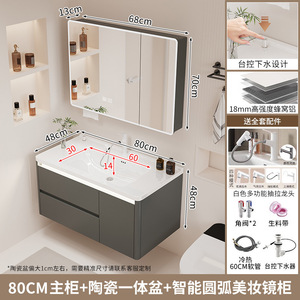 E4 グレー 80cm スマートミラーキャビネット アークセラミック一体型洗面器 [台湾管理排水]