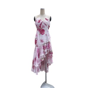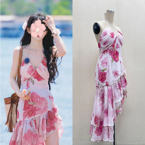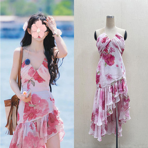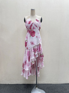 Tian Xiwei の同じスタイルの非対称スカートプリントホルターネックドレス女性のための 2025 夏の新しいスタイルのエレガントなロングスカート