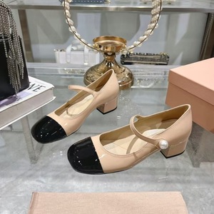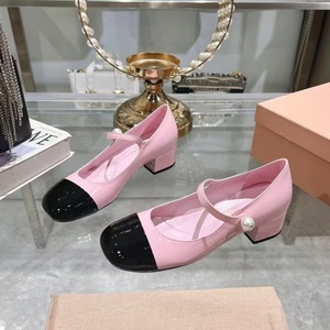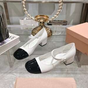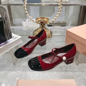 高版miu25春新款方头漆皮珍珠粗跟中跟搭扣珍珠玛丽珍女士单鞋