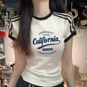 アメリカンスリーバー ストライプ半袖Tシャツ レディース レトロ 和風 薄手 甘辛 夏新作 右肩ショート インストップス