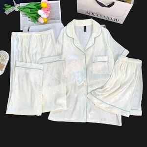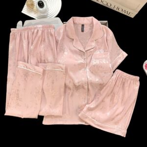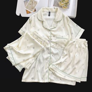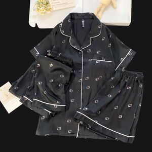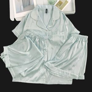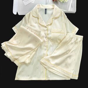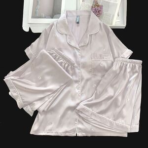 女性用胸パッド付きアイスシルクパジャマ3点セット、高級国民風ジャガード半袖アイスシルクホーム服、夏用薄手スタイル