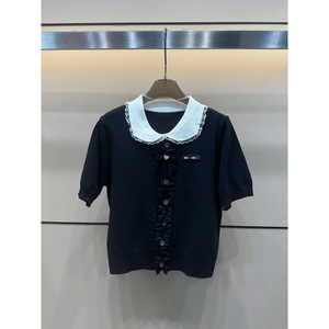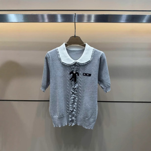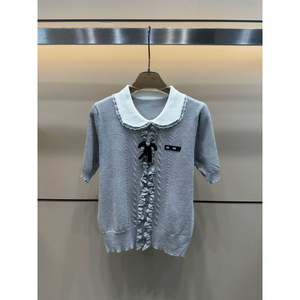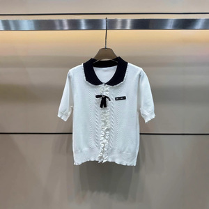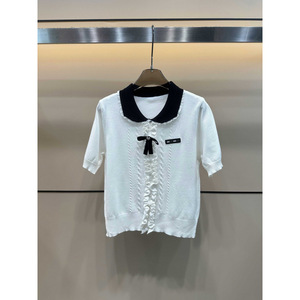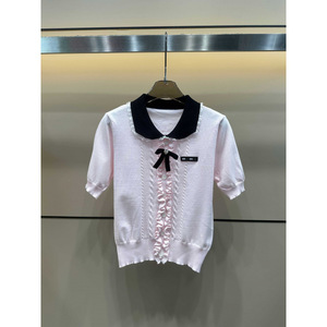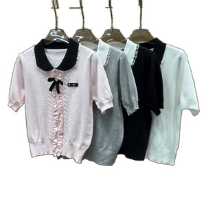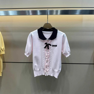 2025 新しい夏 nn レターリボンコントラストカラーラペル半袖プルオーバールーズで多用途な女性のニットトップ