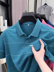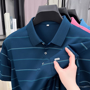 2025 夏ストライプ中年男性のマルベリーシルク半袖 Tシャツラペルカジュアルポロシャツ半袖トップ