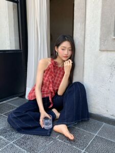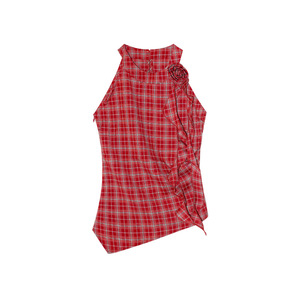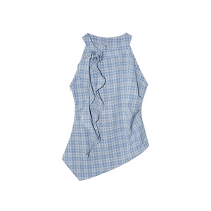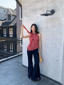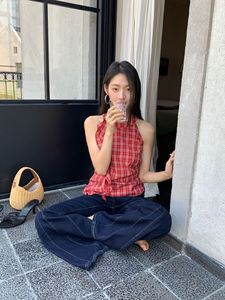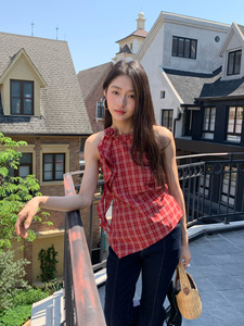 Quanlimei NEWOPEN 25 夏フレンチレトロ絶妙なチェック柄ストリーマースリムノースリーブホルターネックストラップ S5758