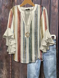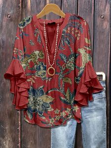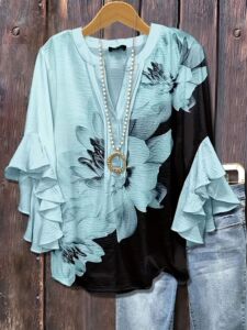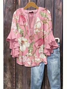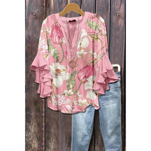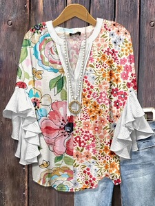 3D新品跨境创意花卉元素印花数码印花休闲潮流V领荷花边T恤女上衣