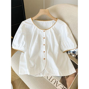 コントラストカラーのラウンドネックパフ半袖シャツ、女性用夏デザインニッチルーズ年齢軽減多用途ショートトップス