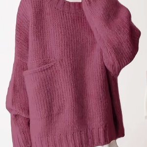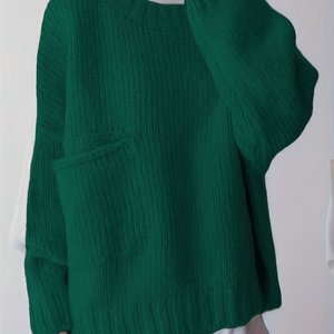 エレガントなプラスサイズ、ティール色のクルーネック、ポケット付きリブセーター