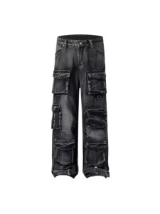 アメリカンレトロ Y2K ウォッシュ加工 ダメージ加工 マルチポケット ワークジーンズ レディース ゆったり ワイドレッグ パンツ レディース ジーンズ