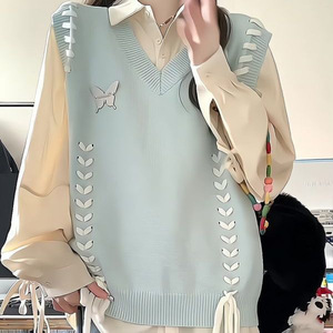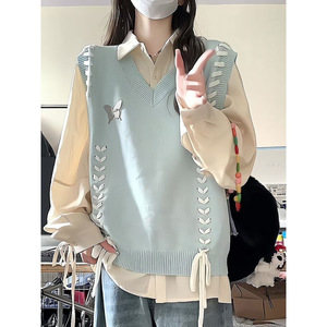 两件套装/学院慵懒风宽松叠穿蓝色领针织马甲背心毛衣绑带衬衫女