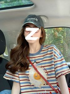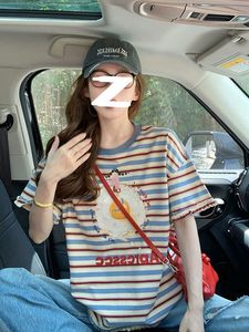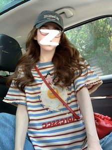 アメリカンレースストライプ半袖Tシャツ女性用2025新作夏右肩ゆったり小柄年齢軽減デザイントップ
