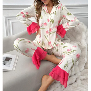跨境翻领开衫睡衣女套装高级感欧美风拼接花边甜美花色家居印花