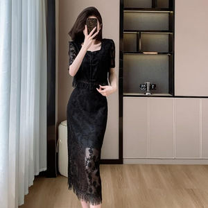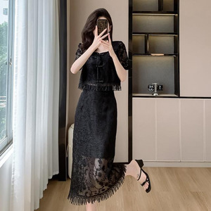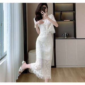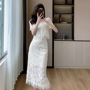 裙子蕾丝显瘦气质白色新中式盘扣方领绣花流苏中长款两件套裙
