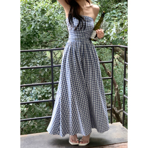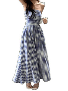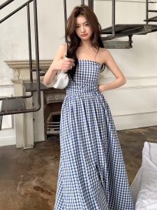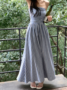 女性のためのドレス 2025 夏の新しいスタイルのハイエンド気質ワンショルダーチューブトップデザイン黒と白のブルーチェック柄ロングスカート