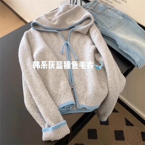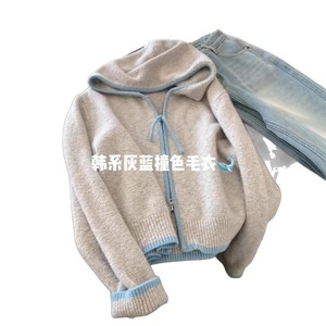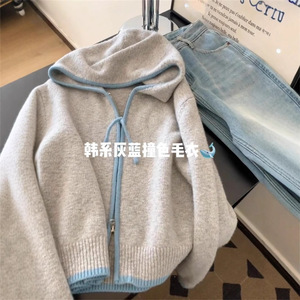 韓国スタイルのコントラストカラーのフード付きニットカーディガン女性のための 2025 秋と冬の新しいルーズソフトワックス状カジュアルジッパーセータージャケット女性のための