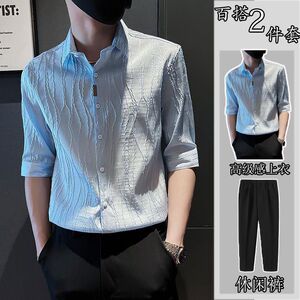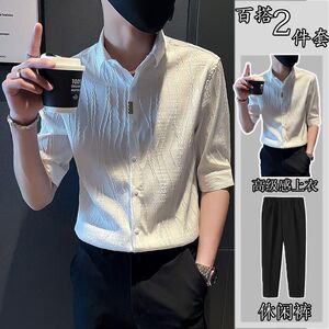 夏季冰丝套装短袖衬衫男士潮牌痞帅高级感搭配西裤两件套中袖男