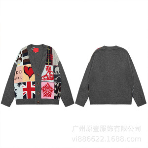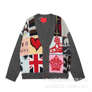 スリースタンダード ヴィヴィアン ウエストウッド サターン ラブ ジャガード ヘビーパッチワーク ウール ニット Vネック カーディガン