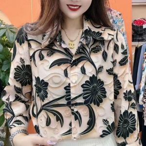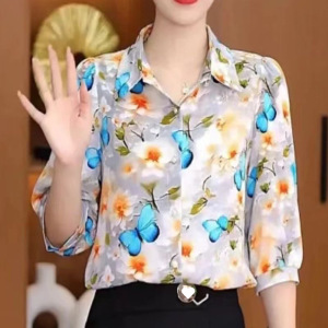 ママの服 2024 秋の新女性のファッショナブルなプリント花柄ラペルシャツ女性の夏のお腹カバートップ