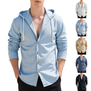 2025 クロスボーダーアマゾンストライプリネンシャツメンズ春と秋の新スリムフード付きカーディガンカジュアルシャツ男性
