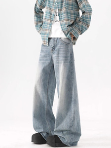 ウォッシュドブルージーンズメンズ夏の雰囲気ハイストリート多用途カジュアルワイドレッグパンツアメリカンルーズワイドレッグパンツ