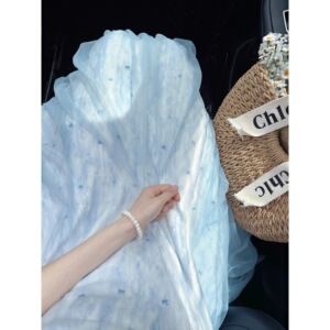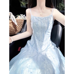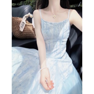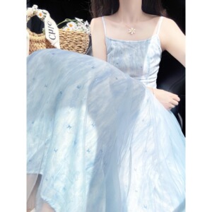 海辺の休暇ライトブルーメッシュサスペンダードレス女性の夏の新しい優しいスタイルホワイトビーチ花柄スカート