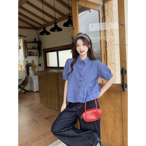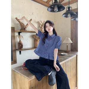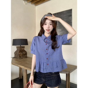 ブルーチェック柄パフスリーブシャツレディース2025夏新作ミュウスタイルフリルシャツトップショートスタイル