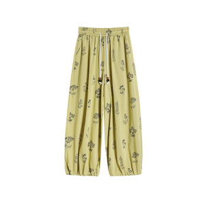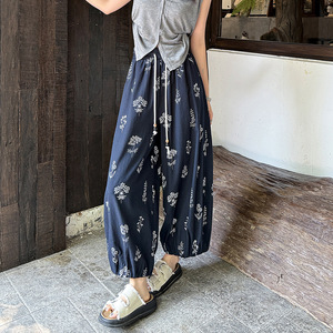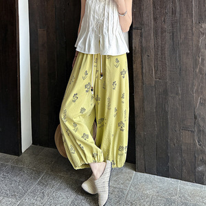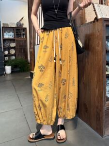 フレンチプリントコットンとリネンの女性用9点パンツ、夏用薄手、小柄、ハイウエスト、スリム、ルーズ、アイスシルク、コットンとリネンのブルマー