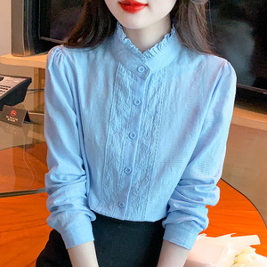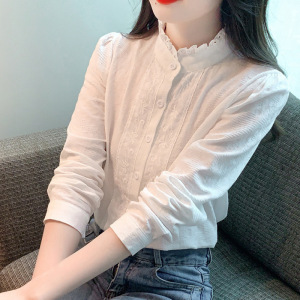 立领刺绣木耳边棉衬衫女春秋2025新款宽松薄款小衫长袖气质上衣