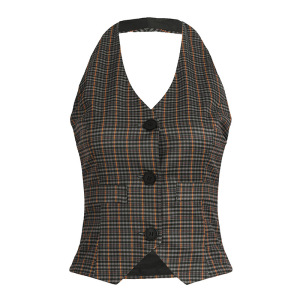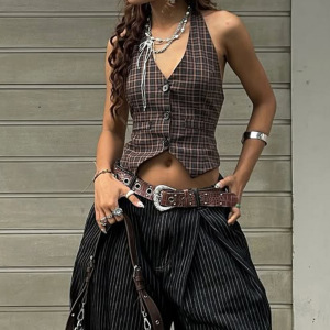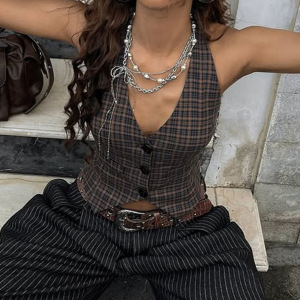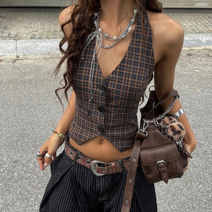 アメリカンホットガールレトロ英国スタイルディープVネックジャケットベストストリートクールチェック柄コントラストカラーウエストベストトップ