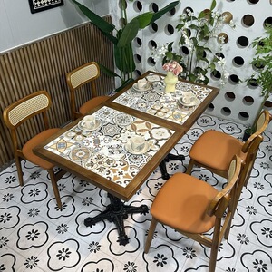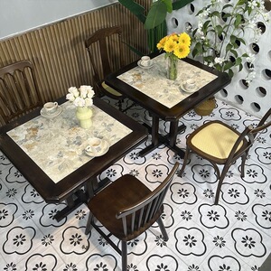 壁に沿った商業用無垢材ラックボードダイニングテーブル、デザートケータリング、ファーストフードレストラン、ホテル鍋バーベキューショップのテーブルと椅子の組み合わせ