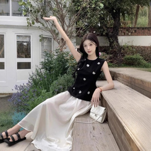 デザイン手作りビーズフラワーノースリーブベストトップハイウエストスカート 2025 夏の新ファッションツーピースセット女性のための
