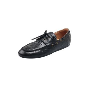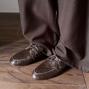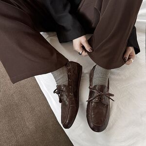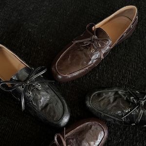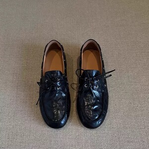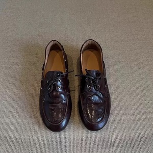 レトロなフレンチハンドグリップパターンのシープスキンラウンドトゥレースアップカジュアルフラットスモールレザーシューズ、スリッポンローファー