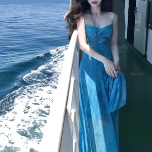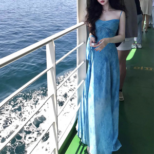 海の娘の新しいブルーシフォンフレンチサスペンダードレスノースリーブホリデースタイルデザインロングスカート2025