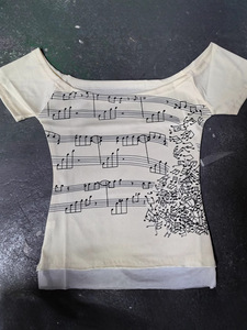 ライトアジアンスタイルメロディー五音スコアプリントワンショルダー半袖Tシャツレディースメッシュパッチワークウエストスリムホットガールトップ