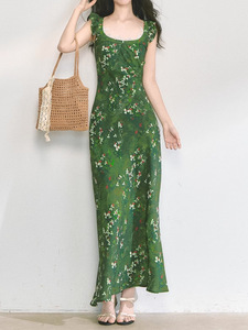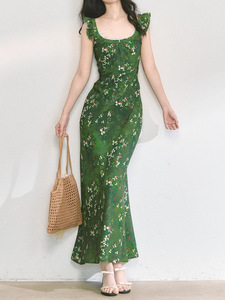 ロマンチックなエスケープ「モネ2.0」ダークグリーンプリントフォレストエルフ酸素感スリムホワイトドレス