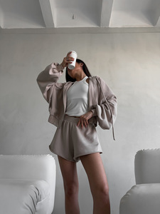 ヨーロッパとアメリカのクロスボーダーカジュアルレディース無地長袖フード付き巾着スウェットシャツショートパンツスーツジャケットショーツ2点セット