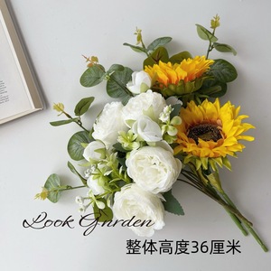 白色牡丹+向日葵+绿叶+酒瓶金架花瓶