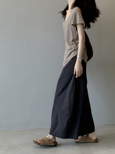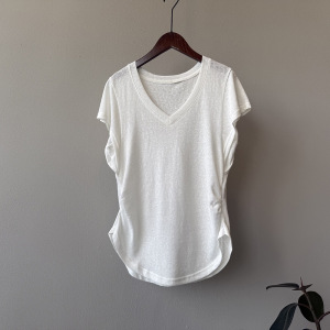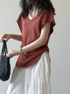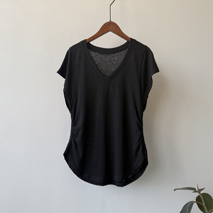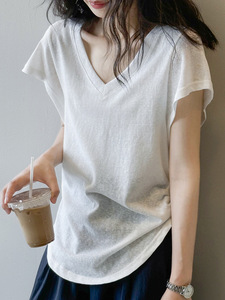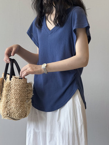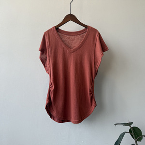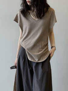 Yanshuang 韓国 V ネックプリーツウエスト Tシャツレディース夏シックな U 字型裾わずかに透けるスリムトップ 82530