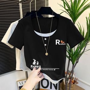 女性用右肩スクエアネック半袖Tシャツ、夏用大きいサイズファットmm、ゆったりスリムデザイン、ニッチな肉感カバー半袖トップス