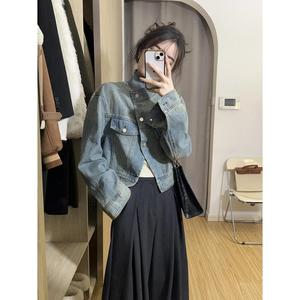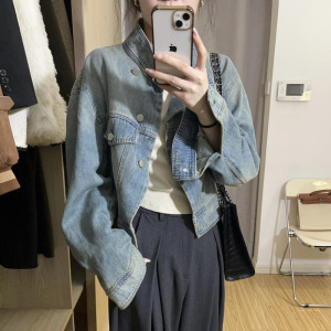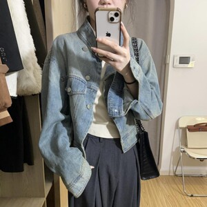 春と秋の女性用ショートデニムジャケット、多用途、ゆったり、小柄なデザイン、ニッチソルトスタンドカラージャケットトップ