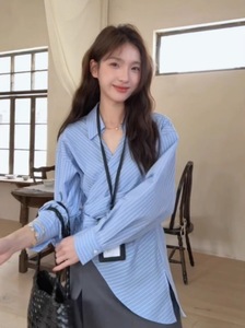 東大門韓国スタイルサイドレースアップウエストクロススモールラペルシャツレディース新作ストライプシャツトップシャツ