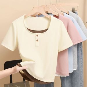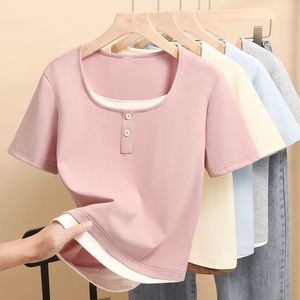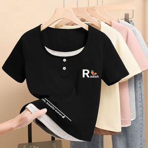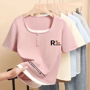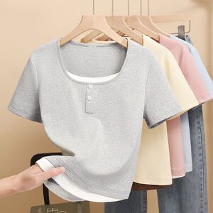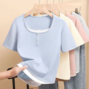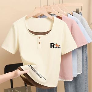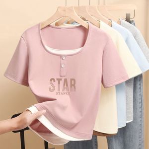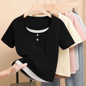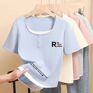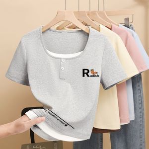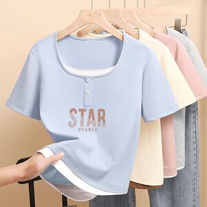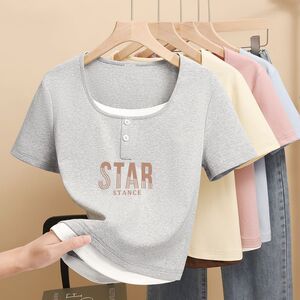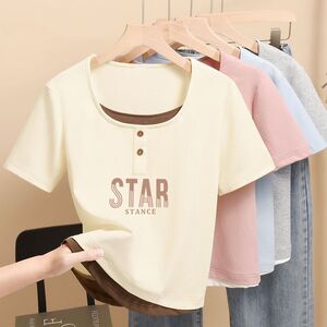 2025 小さなプリントトップ夏の新しい半袖 Tシャツレディース右肩スリムフィット多用途スクエアカラーシンプルな Tシャツトレンディ