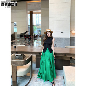 文艺范艺术系穿搭气质韩系穿搭袖开叉上衣绿色半身裙两件套装