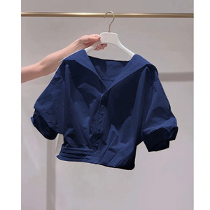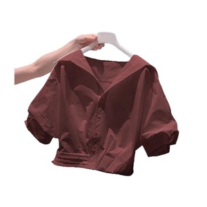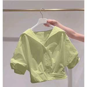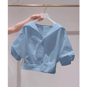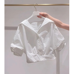 超見栄えの良い白いラペルパフスリーブシャツ女性用2025夏の新しいレイジースタイルルーズショートトップトレンディ