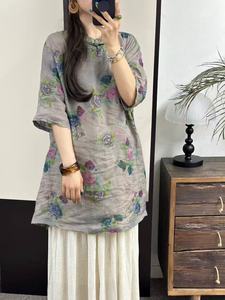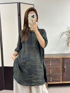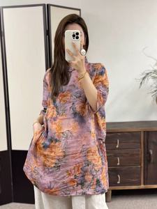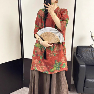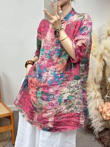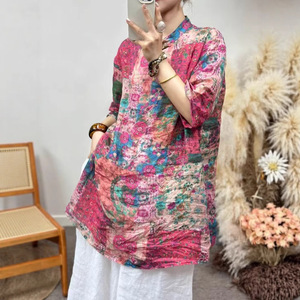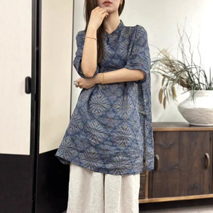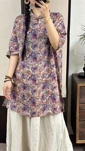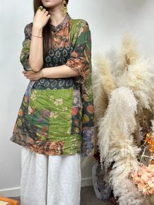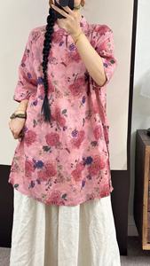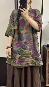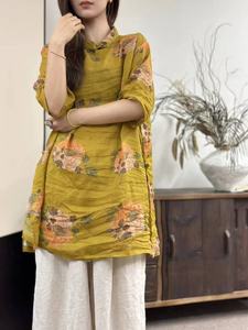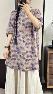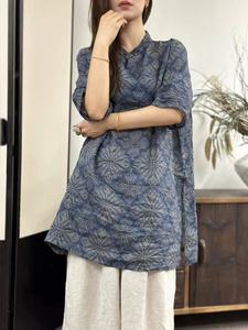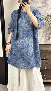 2025 夏文学レトロラミープリントスタンドカラーボタン五分袖ミドル丈プルオーバーシャツ女性用多用途トップ