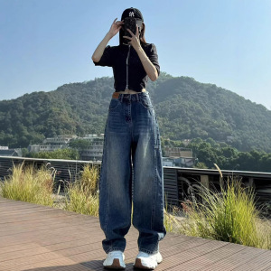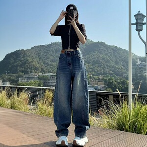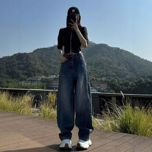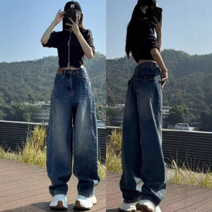 时尚弯刀牛仔裤女大码2025春夏新款梨形身材高腰宽松显瘦阔腿裤子