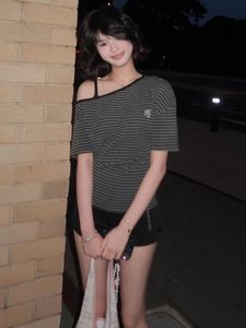 条纹刺绣斜肩短袖t恤女夏季新款修身显瘦露肩美式甜辣妹上衣潮ins