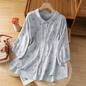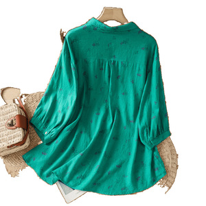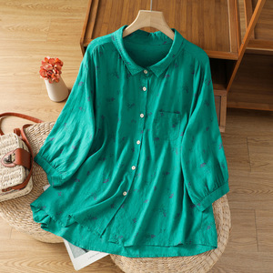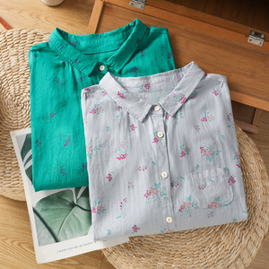 2025年の新しい文学的でレトロなプリントのコットンとリネンのシャツ、女性用ラペルシャツ、夏用の薄い半袖トップスの実物写真