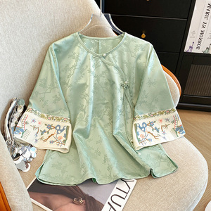 品質保証シルク気質中年女性の新しい中国風の刺繍シャツデザインサテンルーズトップ夏