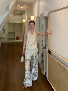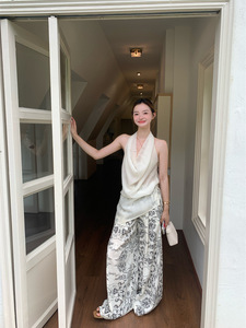 薄手の微透けホワイトスイングカラーホルターネックベスト、女性用夏アウター、高級感のある不規則なルーズスリットノースリーブトップ